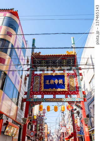 日本の横浜都市景観 9月、横浜中華街・関帝廟通りから「天長門」(関帝廟通)などを望む。奥は横浜大世界