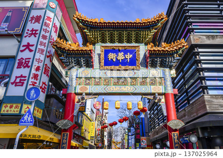 日本の横浜都市景観 観光客らで賑わう横浜中華街。人気の運勢占い店が並ぶ関帝廟通りなどを望む