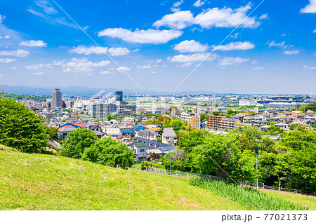 新緑の丘から眺める住宅地