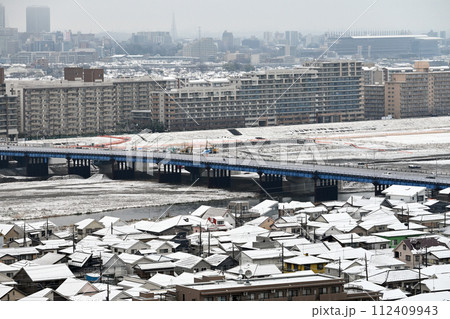 雪化粧された多摩川と沿岸の街並み