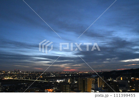 夜明け前の朝焼け空と街の灯り