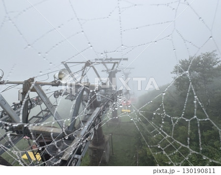 霧深い谷川岳天神平駅_夏の谷川岳ロープウェイリフト_霧の粒を纏う蜘蛛の巣