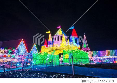 栃木県足利市 あしかがフラワーパークのイルミネーション フラワーキャッスルに連なる観光客