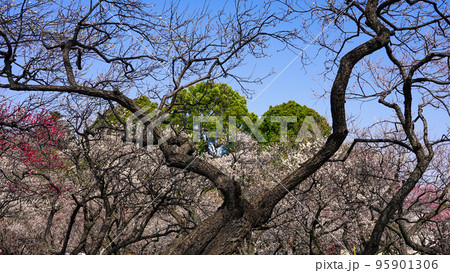 青空に映える谷保天満宮梅林の紅梅白梅(東京都国立市)