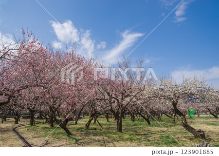 青空に映える谷保天満宮梅林の紅梅白梅(東京都国立市)