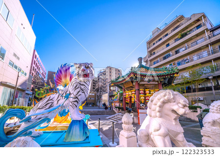 日本の横浜都市景観7年1月。2025春節燈花。山下町公園・「會芳亭」前に聖獣がズラリ…=22日