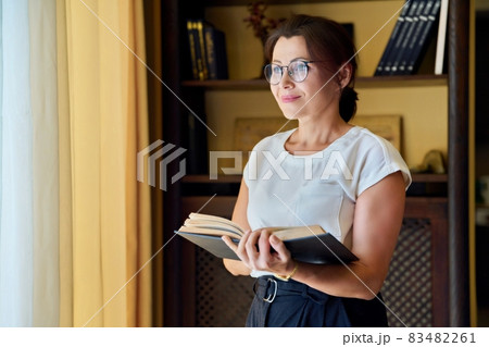Serious concentrated mature woman in glasses with a book