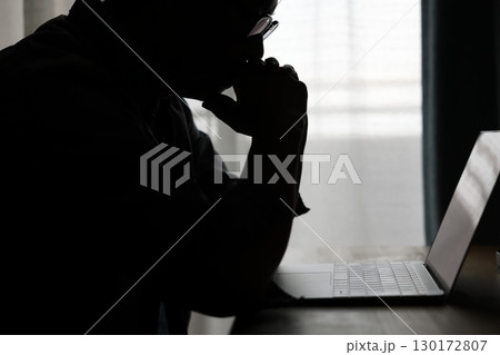 暗い部屋でパソコンを使う男性