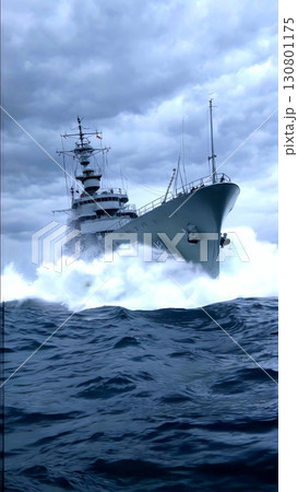 Massive naval vessel navigating turbulent sea under dark storm clouds, embodying maritime strength and naval prowess