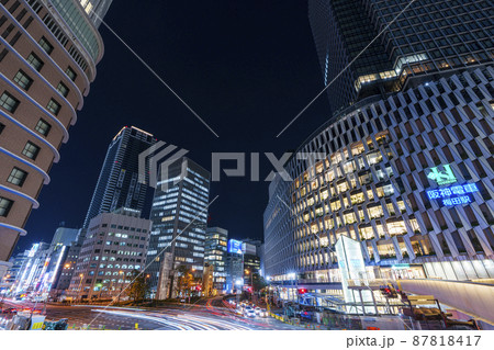 夜の大阪梅田 JR大阪駅前の街並み 大阪ステーションシティとヨドバシカメラ