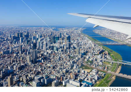 大阪国際空港着陸前に見える淀川や大阪の町並みを空撮