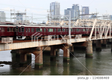 新淀川橋梁を渡る阪急神戸本線1000系電車(特急列車)