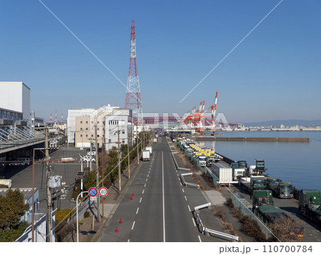 大阪港内港のガントリークレーンとコンテナターミナル