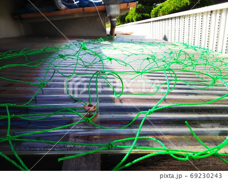 台風前、即席の防風対策にポリカ波板の屋根を緑色の農業用ネットで覆って補強