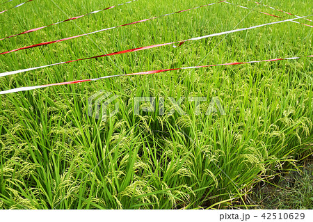 水田の稲穂の上に張られた鳥よけテープ