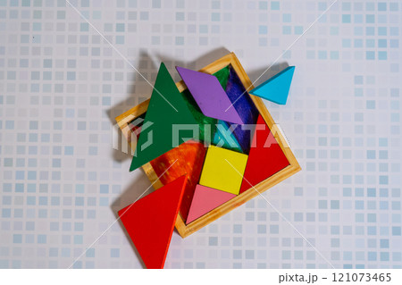 Colorful Tangram puzzle with its messy container on a wooden table.