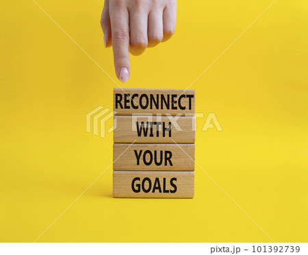 Reconnect with your Goals symbol. Wooden blocks with words Reconnect with your goals. Beautiful yellow background. Businessman hand. Business and Reconnect with your goals concept. Copy space.
