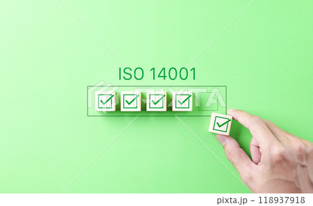 ISO 14001 Environmental Management Certification Concept. Hand places a checkmark block under the ISO 14001 label, symbolizing quality control, certification for environmental management systems (EMS)