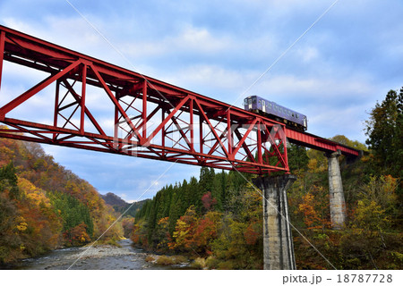紅葉と赤い鉄橋を渡る秋田内陸線