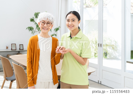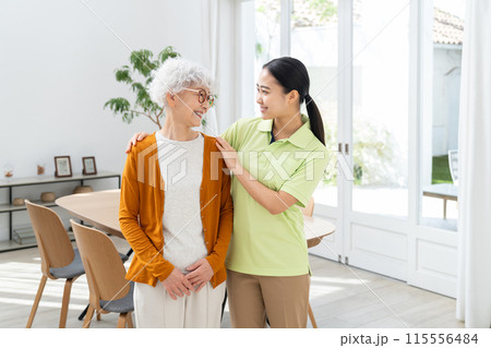 介護移設の高齢者の女性と若い介護福祉士