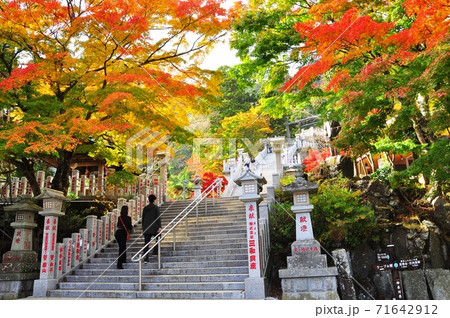 伊勢原市 鮮やかな紅葉樹木に覆われた大山阿夫利神社(下社)境内の参集殿前階段