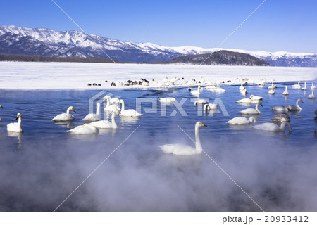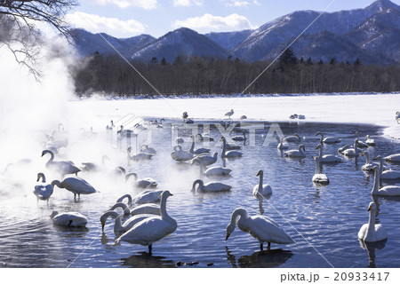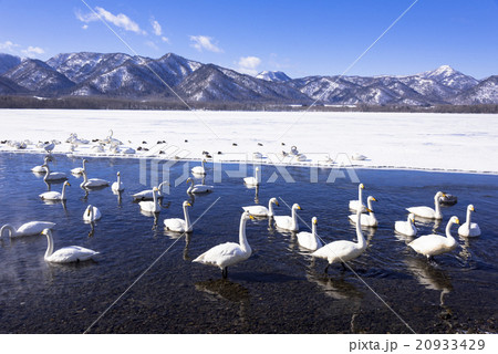 湖面に浮かぶたくさんの白鳥,北海道屈斜路湖
