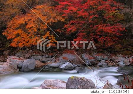 長野県木曽郡大桑村野尻 阿寺渓谷の紅葉と阿寺川の流れスローシャッター撮影