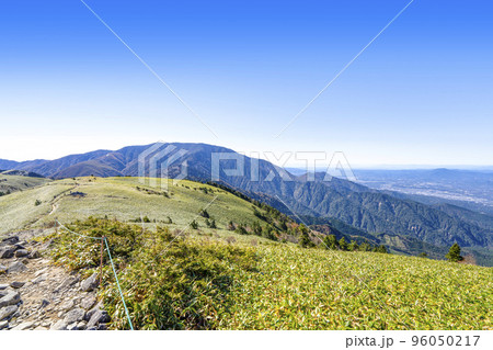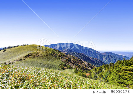 長野阿智村と岐阜中津川の間にある紅葉の時期の日本百名山の恵那山の広河原ルートの紅葉と青空