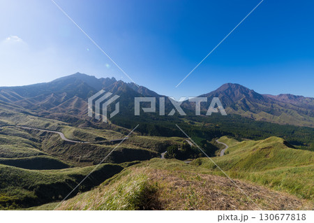 阿蘇山を背景に映える絶景ドライブ美景絶景を求めて草原の中を駆けぬける風景(阿蘇市)