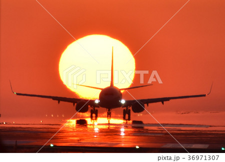 着陸する旅客機と夕陽