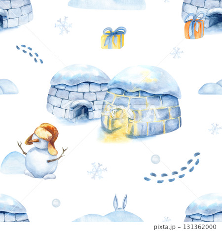 Christmas Inuit seamless pattern, igloo, snowman, holiday winter landscape isolated from background. Watercolor children illustration, New year scenery, snowflake, xmas, footprint, snowdrift