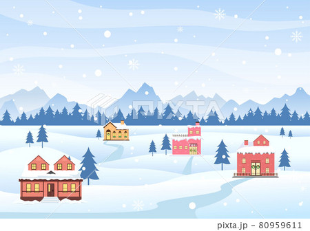 Winter Landscape With House Background, Panorama Snowfall, Town, Trees Or Mountain Silhouette. Christmas and Happy New Year Vector Illustration