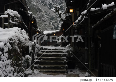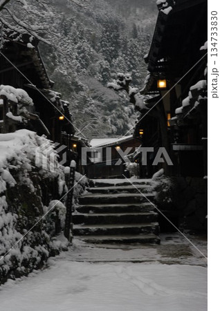 冬の長野県妻籠宿は、雪が止んであたりはしんしんと冷え込んでいます。