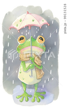 雨の中傘をさすかわいいカエル、漫画風、水彩画「AI生成画像」