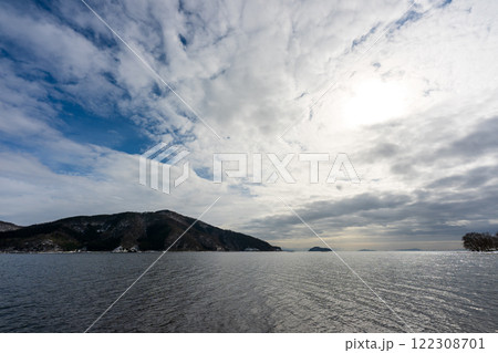 滋賀県高島市海津大崎冬の降雪時の竹生島を撮影