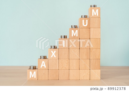 最大・上限のイメージ|「MAXIMUM」と書かれた積み木とコイン