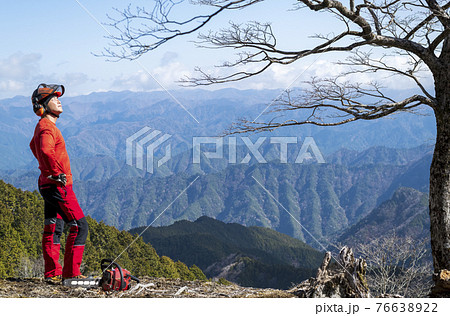 整備が終わった山の頂上に到着して太陽を見上げる男性林業家