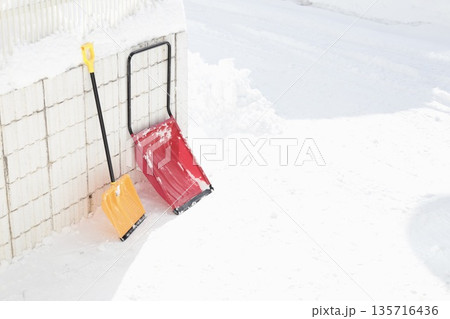 雪が積もった塀に立てかけたママさんダンプと除雪スコップ