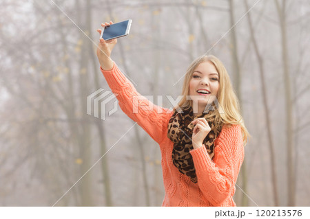Autumn portrait of stylish beautiful young woman model blowing kiss in orange french beret, glasses
