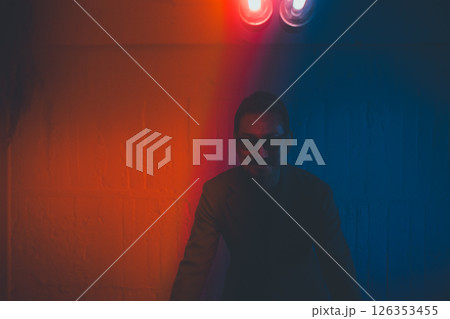 陰謀論者のブロックとスーツを着たミドル男性ビジネスマン