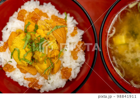 陸奥湊駅前市場の食堂のうにいくら丼(青森県八戸市)上から