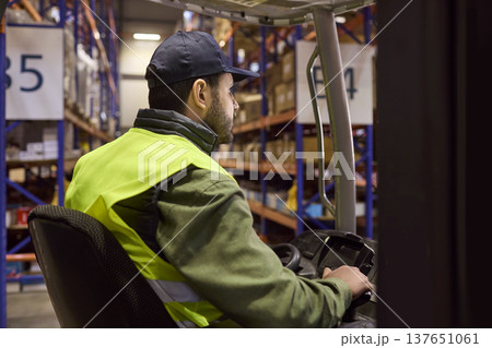 Warehouse forklift operator driving through racking aisle for logistics operations