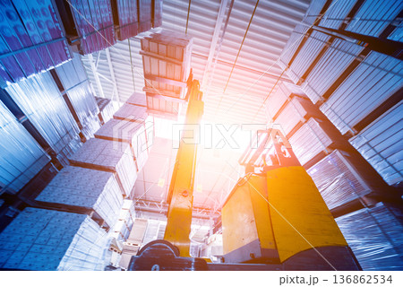 Forklift loader in storage warehouse ship yard. Distribution products.