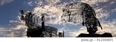 Air defense radars of military mobile anti aircraft systems (radar is designed and automatic tracking of targets and missiles) , modern army industry on background clouds and sky,Russia