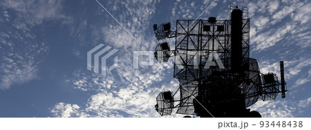 Air defense radars of military mobile anti aircraft systems, modern army industry on background beautiful clouds and sky, Russia