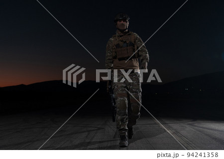 Army soldier in Combat Uniforms with an assault rifle, plate carrier and combat helmet going on a dangerous mission on a rainy night.