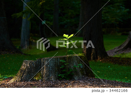 暗い森に差し込んだ一筋の光に向かって新芽が葉を広げる
