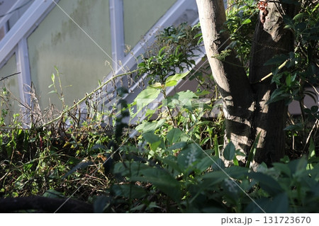 初冬の鈍い陽を浴びているヤツデの葉