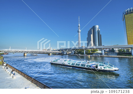 日本の東京都市景観 水上バス「ヒミコ」と新名所「すみだリバーウォーク」(画面奥)などを望む