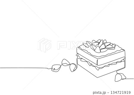 Single line drawing of a square, layered strawberry shortcake, garnished with berries scattered around, symbolizing a delightful and fresh dessert. National Strawberry Shortcake Day event.